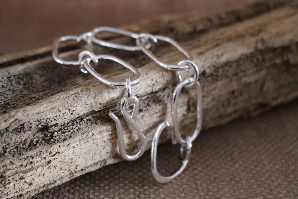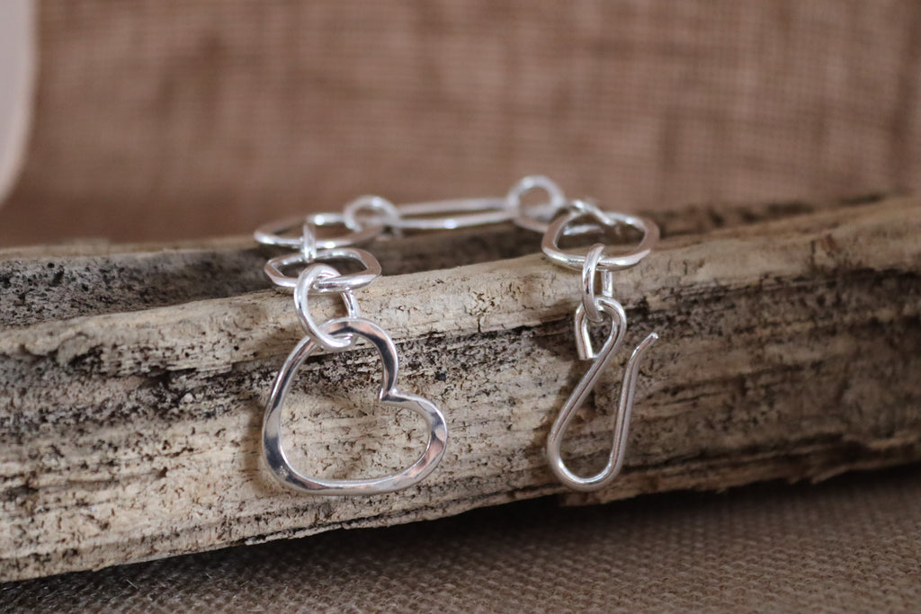 A chunky sterling silver bracelet with an elegant modern design. It features elongated, slightly irregular hand forged links, finished with the standout feature - a heart shaped link. This can be incorporated in to the chain or left dangling as a charm. The clasp is a simple s-hook, which blends seamlessly with the overall design. It allows an adjustable length to the bracelet 19 - 22cm.