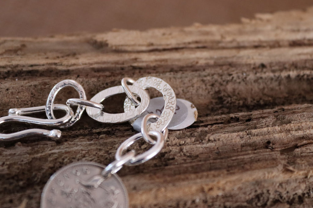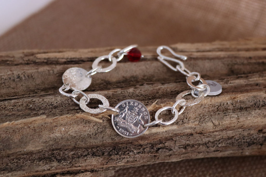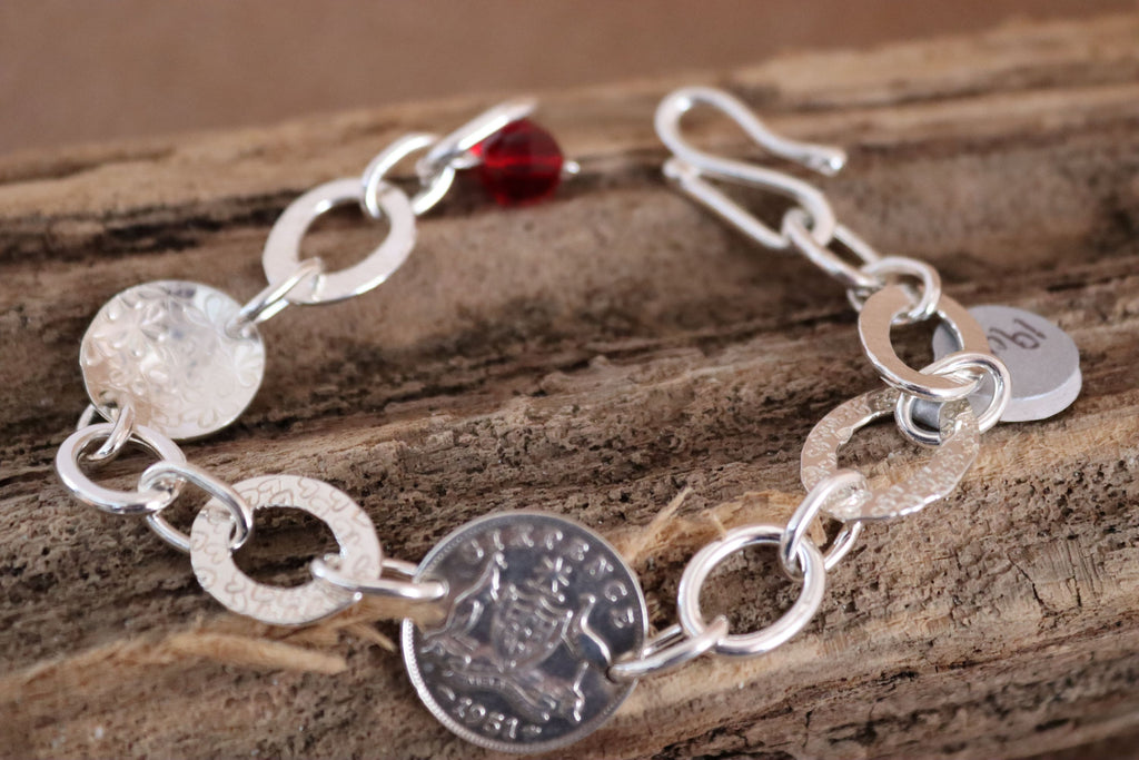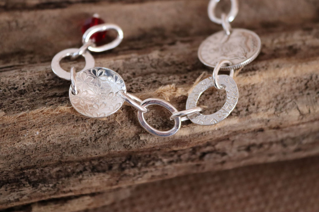 This bracelet has a unique and artistic design, combining vintage and handcrafted elements. It features mixed shape links, hand forged and individually stamped. The red faceted bead adds a pop of colour. The central feature though is the 1951 sixpence. It is a blend of vintage with artisan silversmithing. Finished with a sturdy s clasp lending it adjustability in length. The length of this bracelet is 19cm. This is a one off piece.