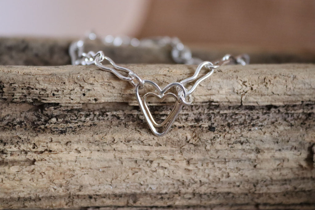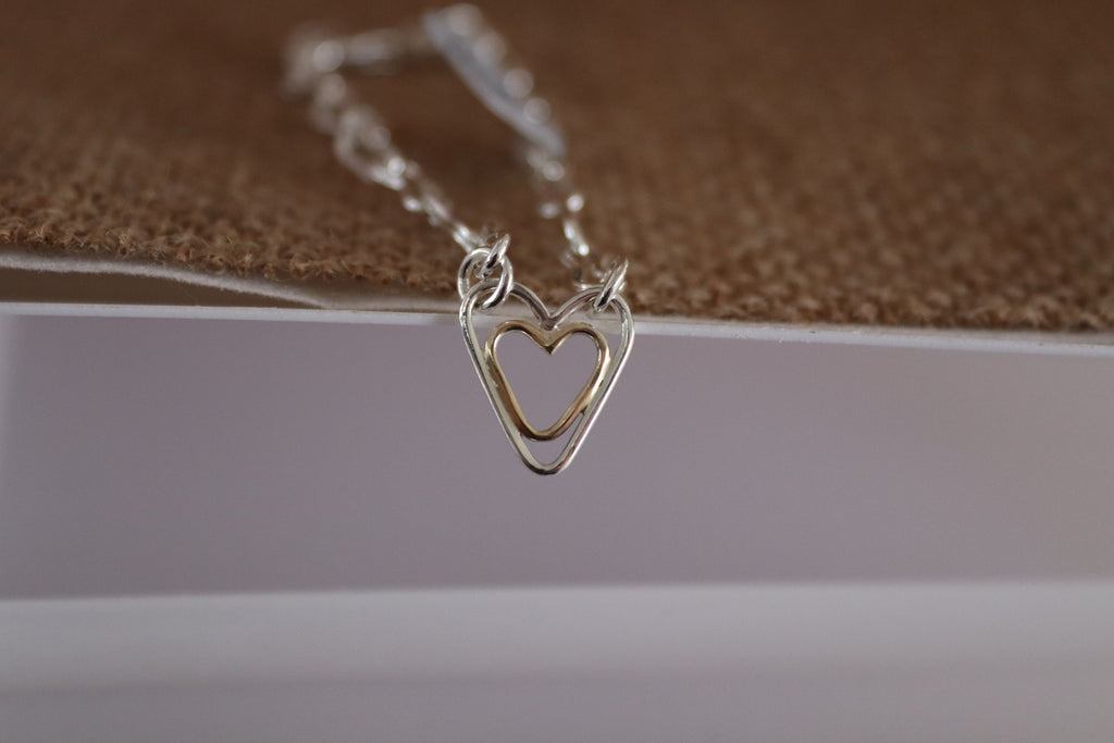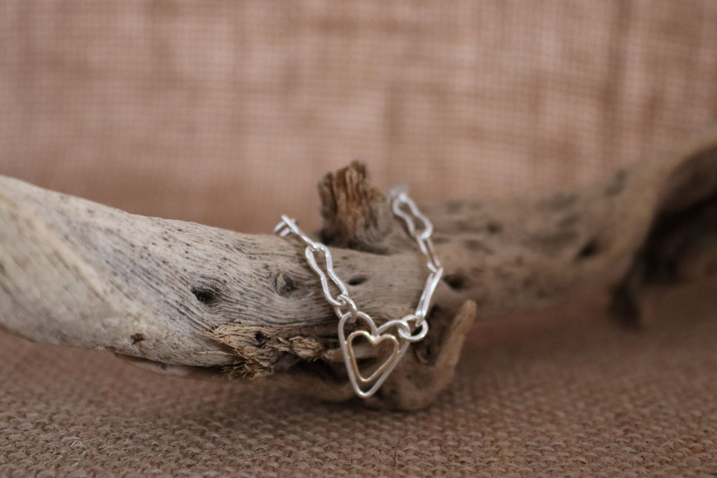 A timeless piece. A delicate silver bracelet with an accent of gold in the form of a heart. A beautiful gold heart nestled inside a silver heart on a delicate 'peanut' link bracelet. This has a 'parrot' clasp for closure which does allow for some adjustability with length. The bracelet pictured is 18cm long.