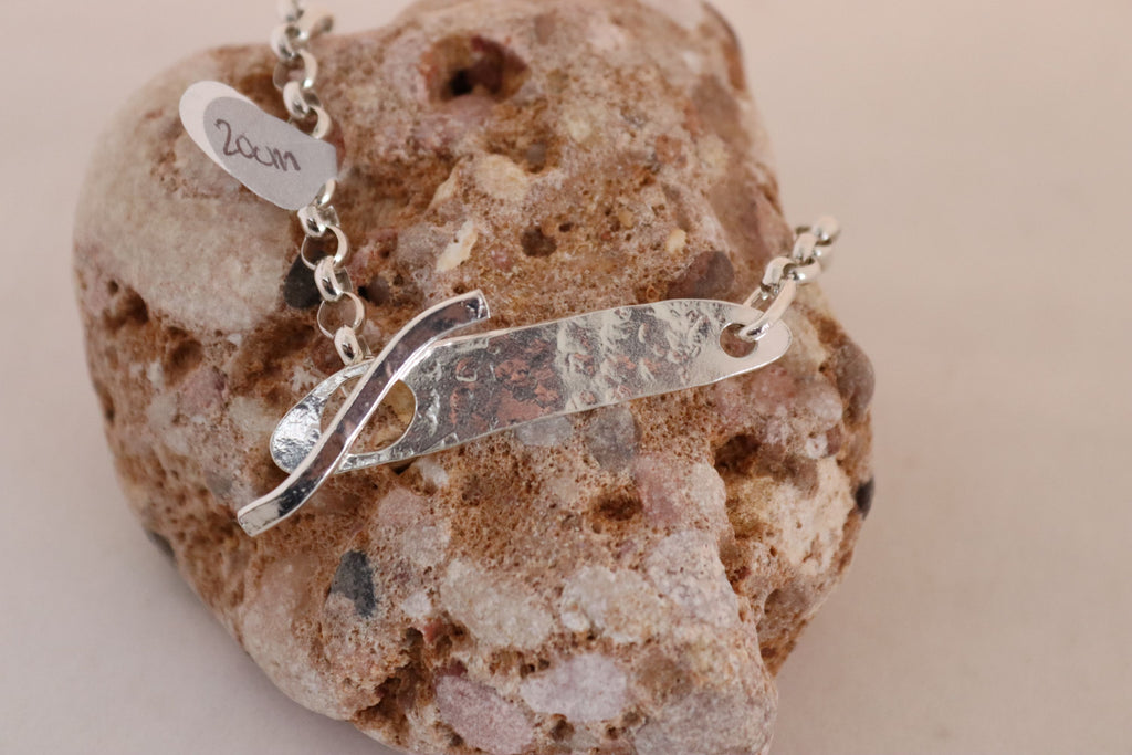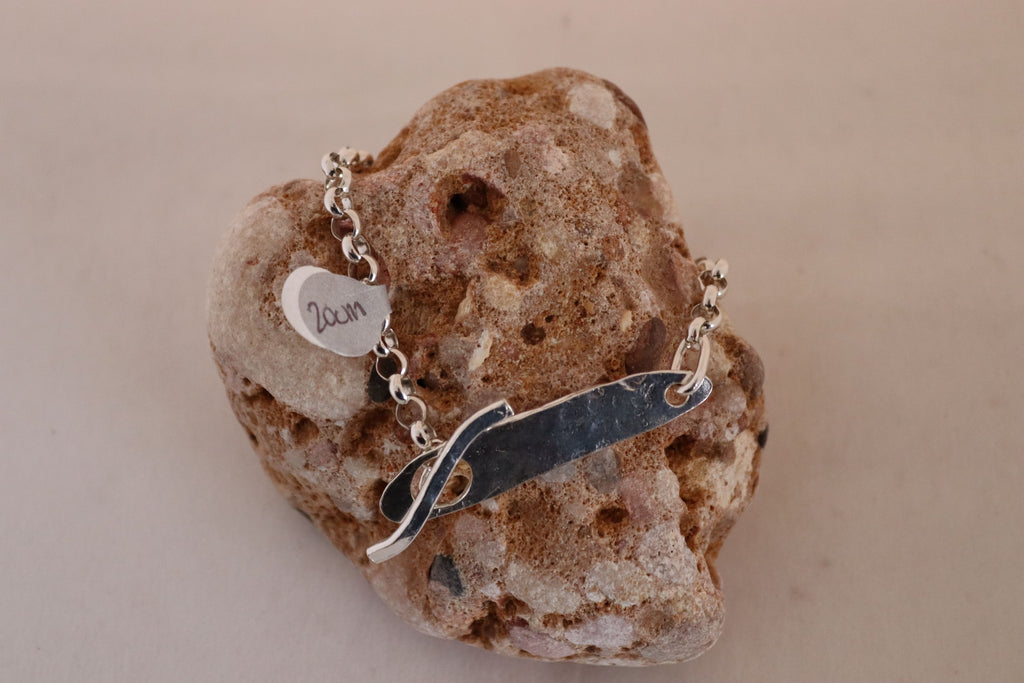 A unique, unisex bracelet. The toggle is made from recycled silver which is then set on a recycled chain. A combination of artisan silverwork and sustainability. The bracelet pictured is a unique one off piece, measuring 20cm. Perfect for every day wear.
