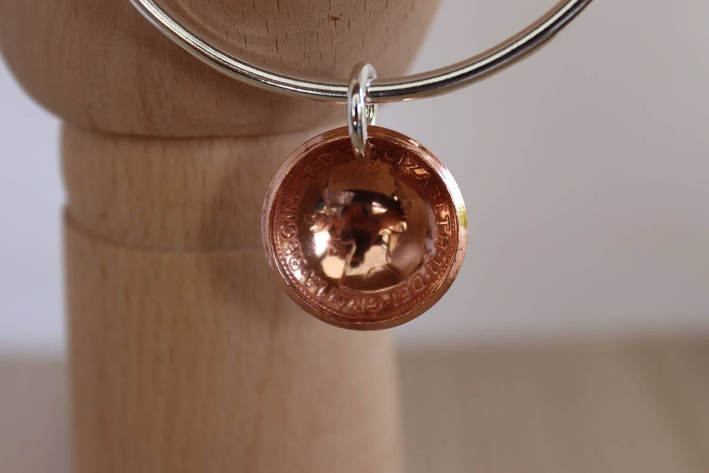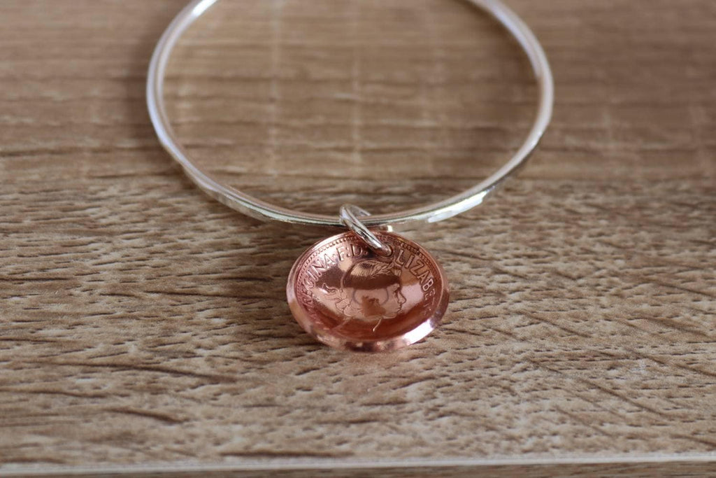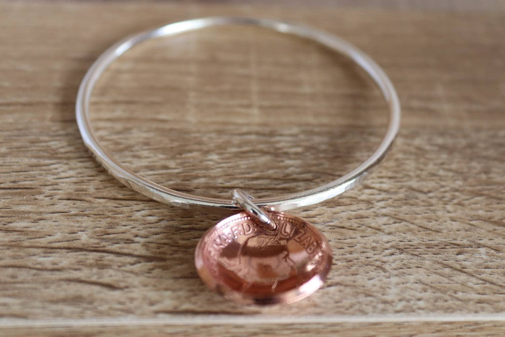 Softly hammered sterling silver bangle, made from 3mm wire with domed Australian half penny. Currently a medium (64.5mm) bangle available, Other sizes can be made to order.