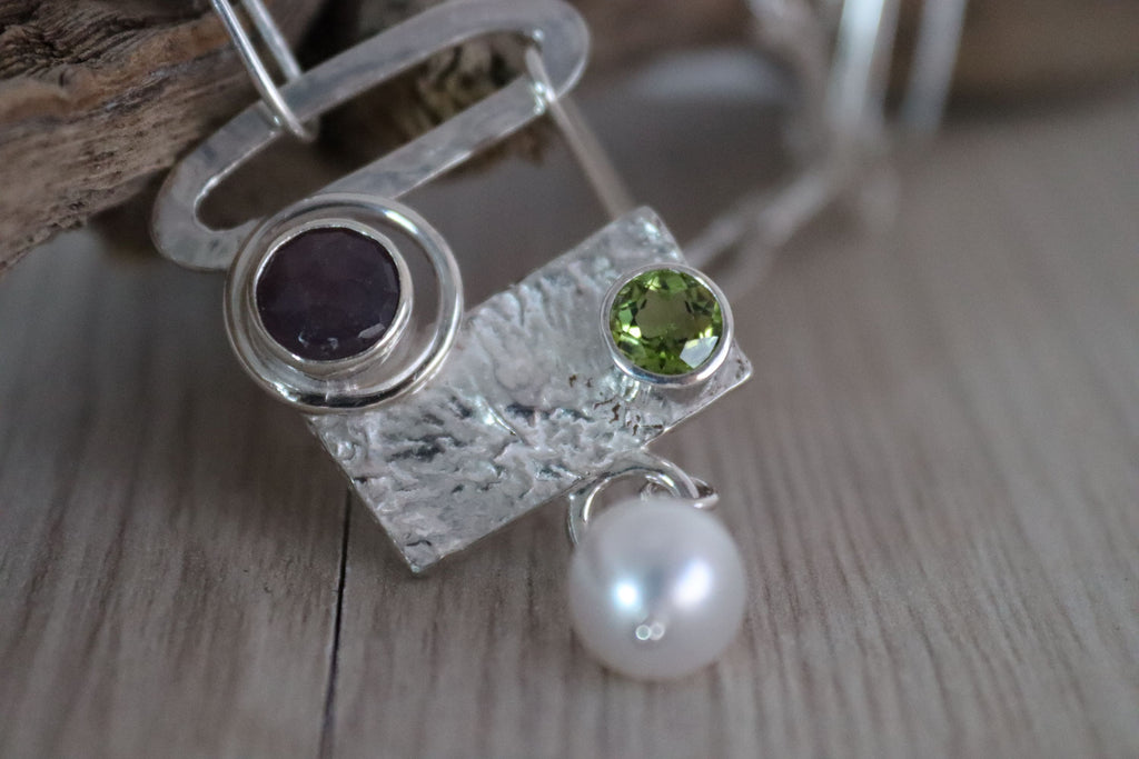 Sterling silver paperclips necklace with Ruby, Peridot and Cultured Pearl