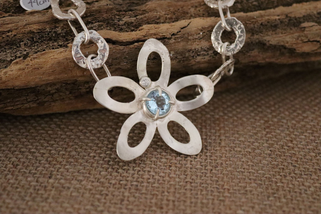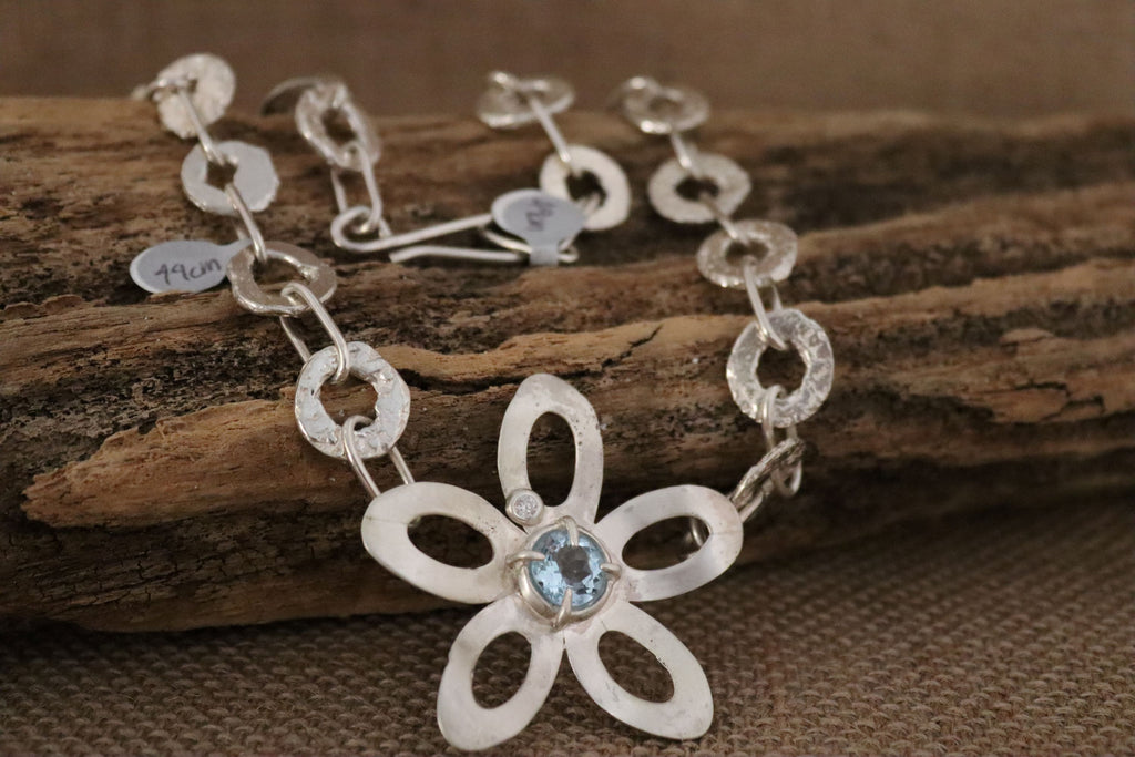 A whimsical hand made flower with a satin finish, with a central sparkling blue topaz. Alongside is a white CZ, reminiscent of a dew drop. The chain holding this beautifully designed setting is made up of uniquely individual hand forged links, altogether measuring 49cm. Is this your signature piece, to be loved for a lifetime and more.